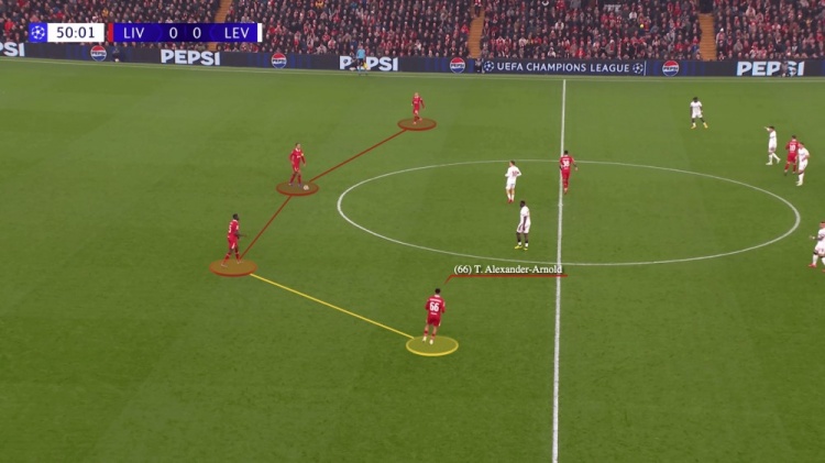 利物浦会在进攻组织阶段的初期,让边后卫的位置更加靠后一些,这与弗林蓬在勒沃库森的情况明显不同。同时,我们还需要注意一个问题:前文的案例中我们都能看到,弗林蓬在勒沃库森的右路有大片空间可以利用,但在利物浦呢,这一区域更多是萨拉赫来掌控。