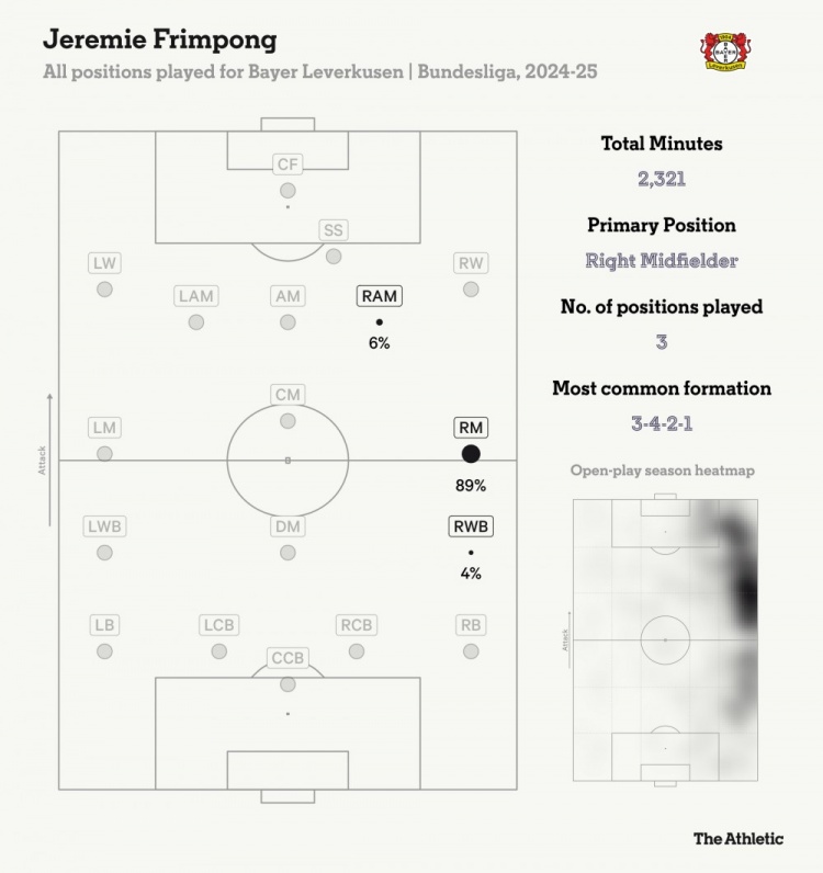 2024/2025赛季弗林蓬在勒沃库森的出场位置分布&场上热图